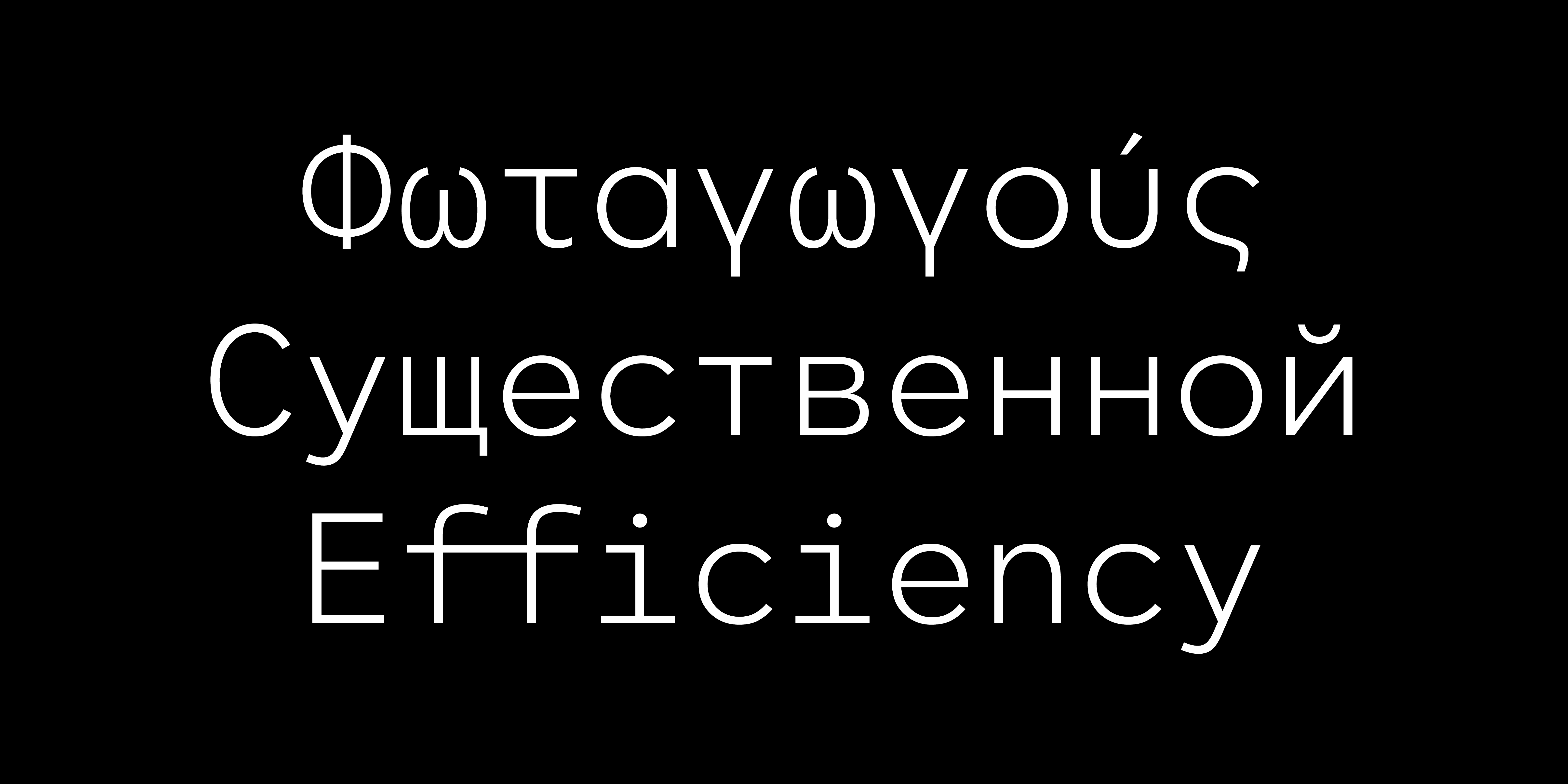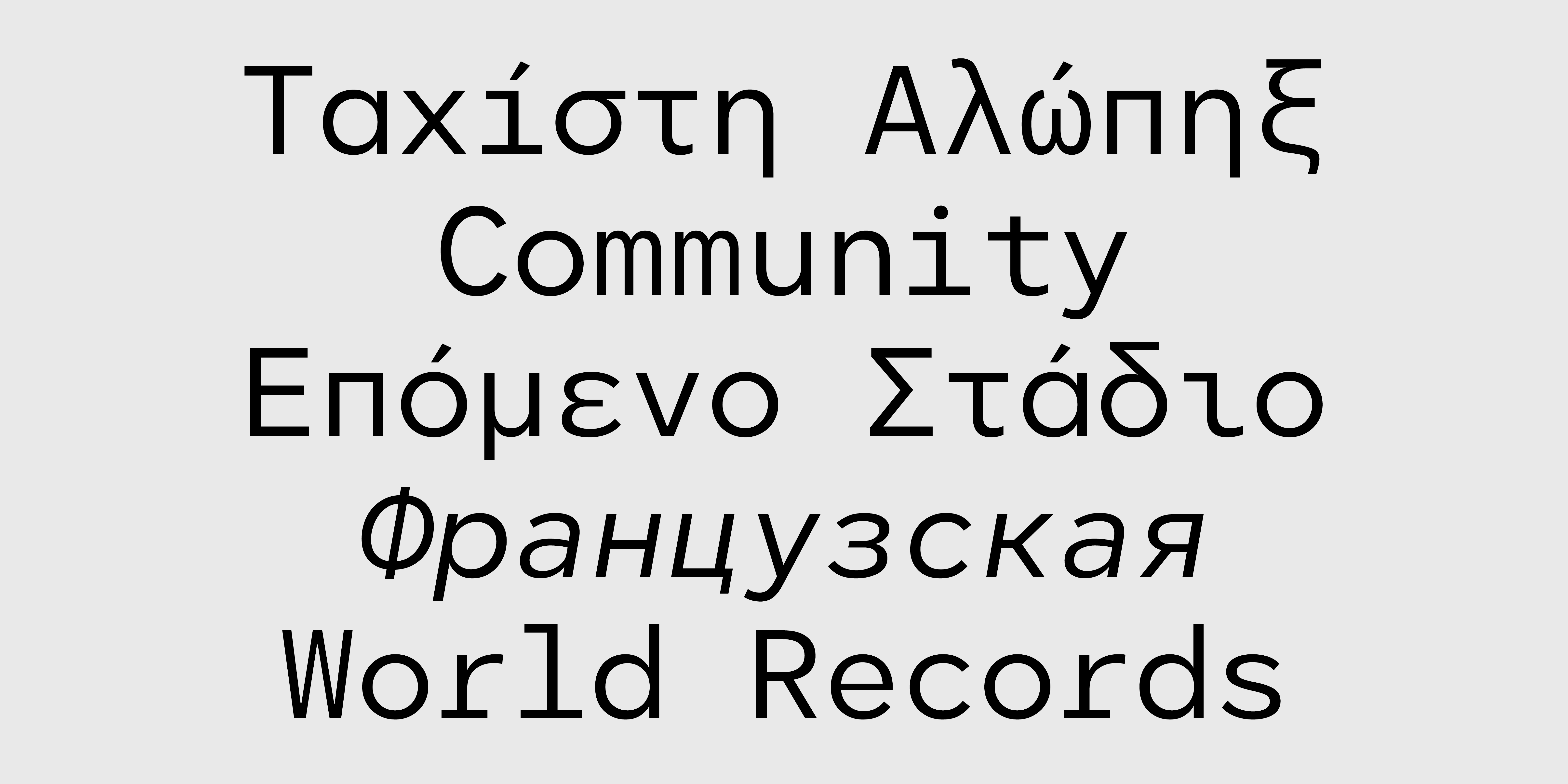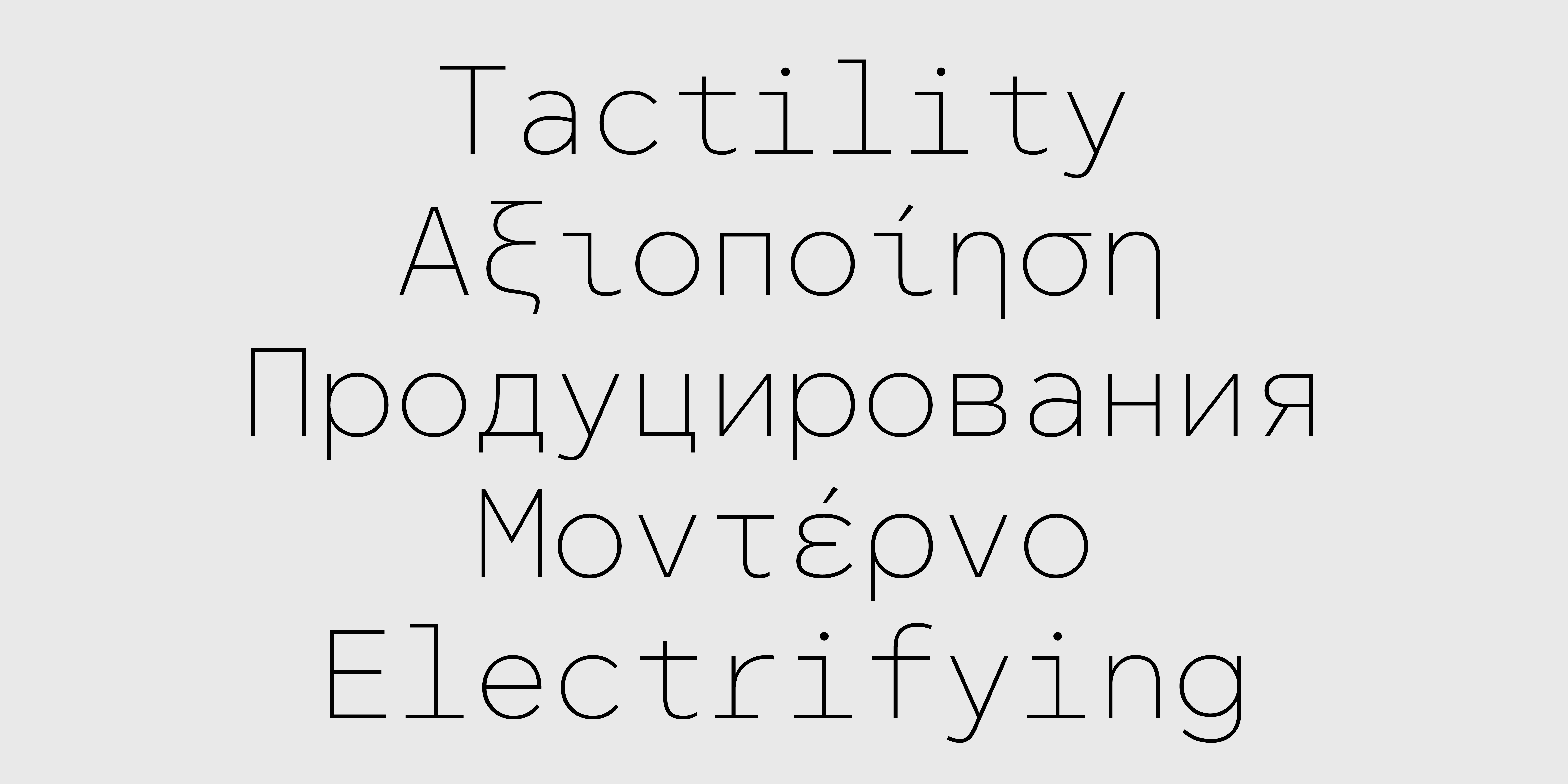 Thin Thin Oblique Light Light Oblique Regular Oblique Medium Medium Oblique Bold Bold Oblique Black Black ObliqueΗ πολύ δημοφιλής γραμματοσειρά CF Asty διαθέσιμη σε έκδοση σταθερού πλάτους (monospaced). Το σχέδιο έχει προσαρμοστεί με σκοπό να προσδώσει μια digital αισθητική, απαραίτητη για χρήσεις όπου απαιτείται μοντέρνα, ψηφιακή ή και φουτουριστική αίσθηση. Παράλληλα, με την κατάλληλη αυξομείωση του πλάτους των χαρακτήρων μέσα στο προκαθορισμένο χώρο που εντάσσεται ο καθένας, μειώνονται τα κενά και οι αντιφόρμες που προκύπτουν από την έλλειψη kerning με σκοπό να βελτιωθεί η ευαναγνωσιμότητα σε μεγαλύτερα κείμενα. Η CF Asty Mono υποστηρίζει Greek, Western, Extended Latin καθώς Cyrillic character sets ενώ είναι διαθέσιμη και σε Variable αρχείο χωρίς επιπλέον χρέωση.