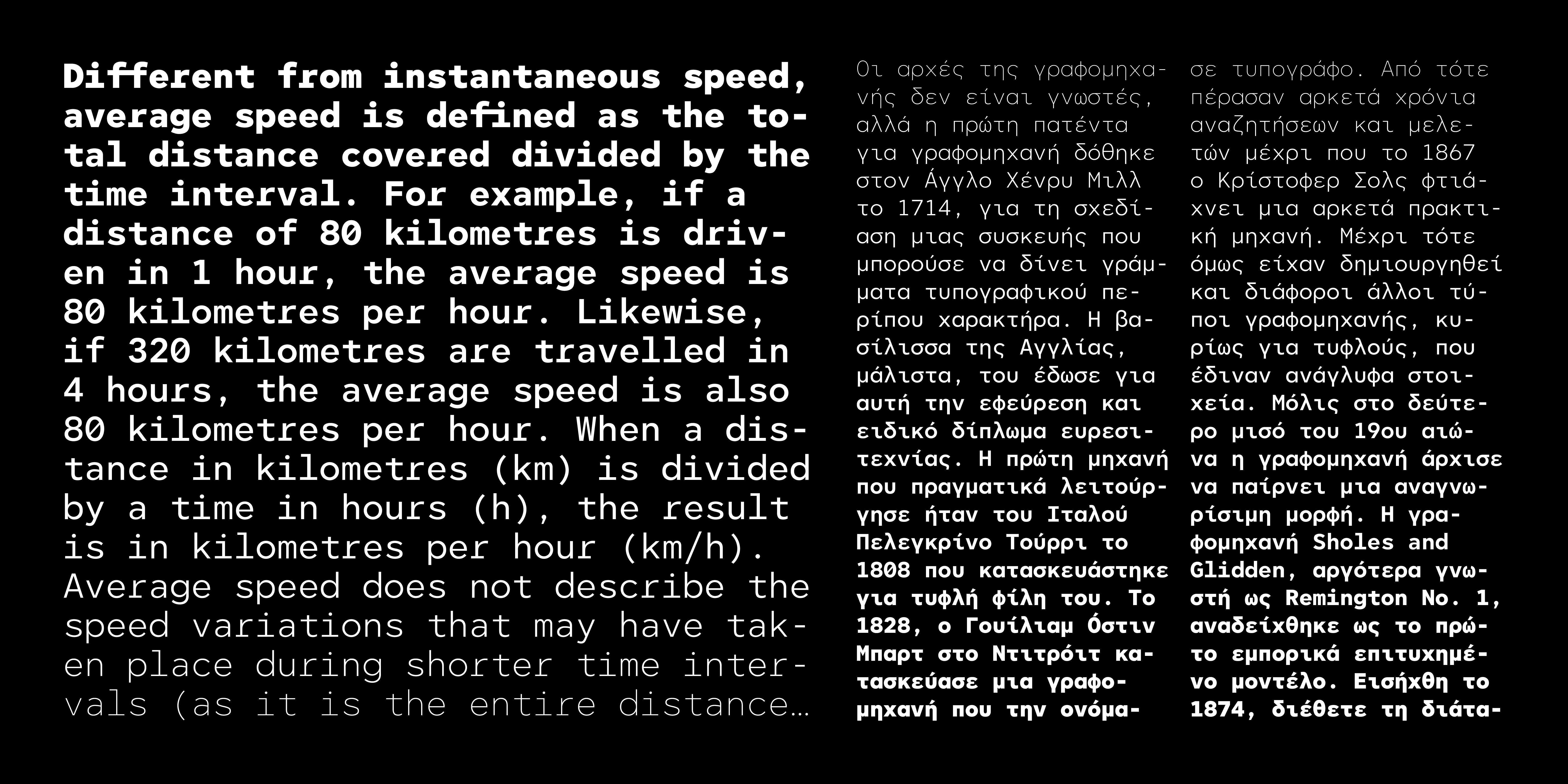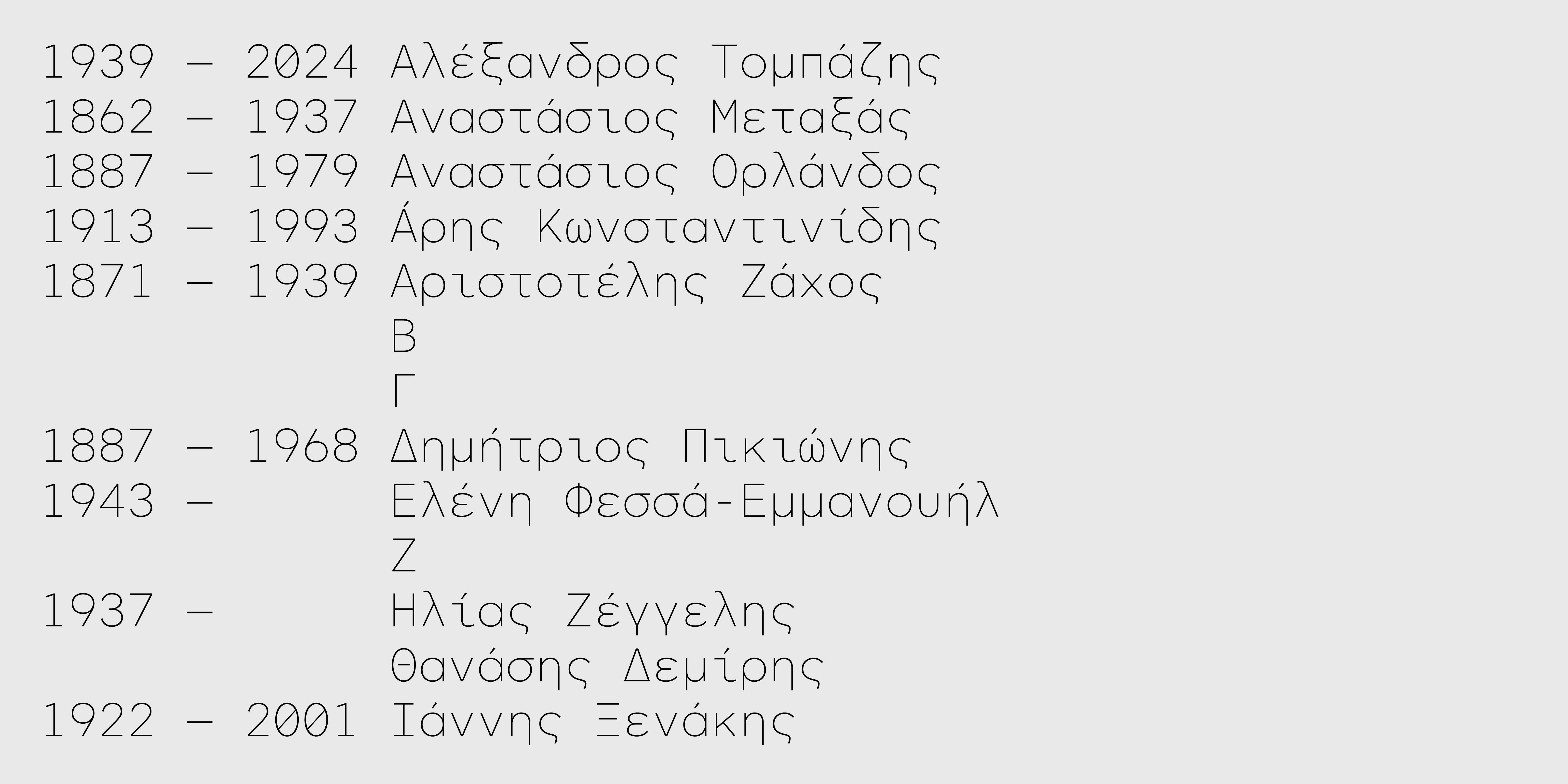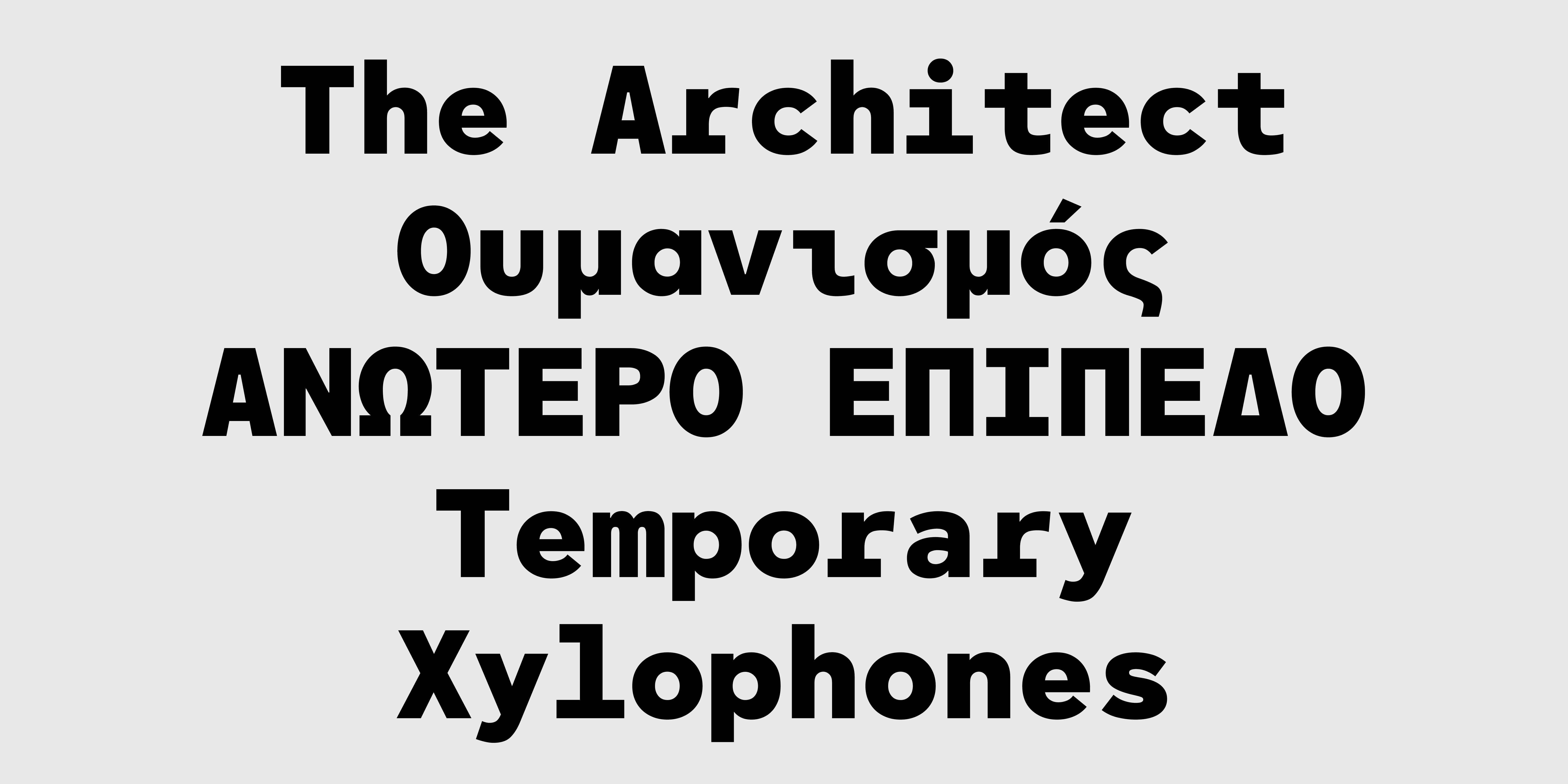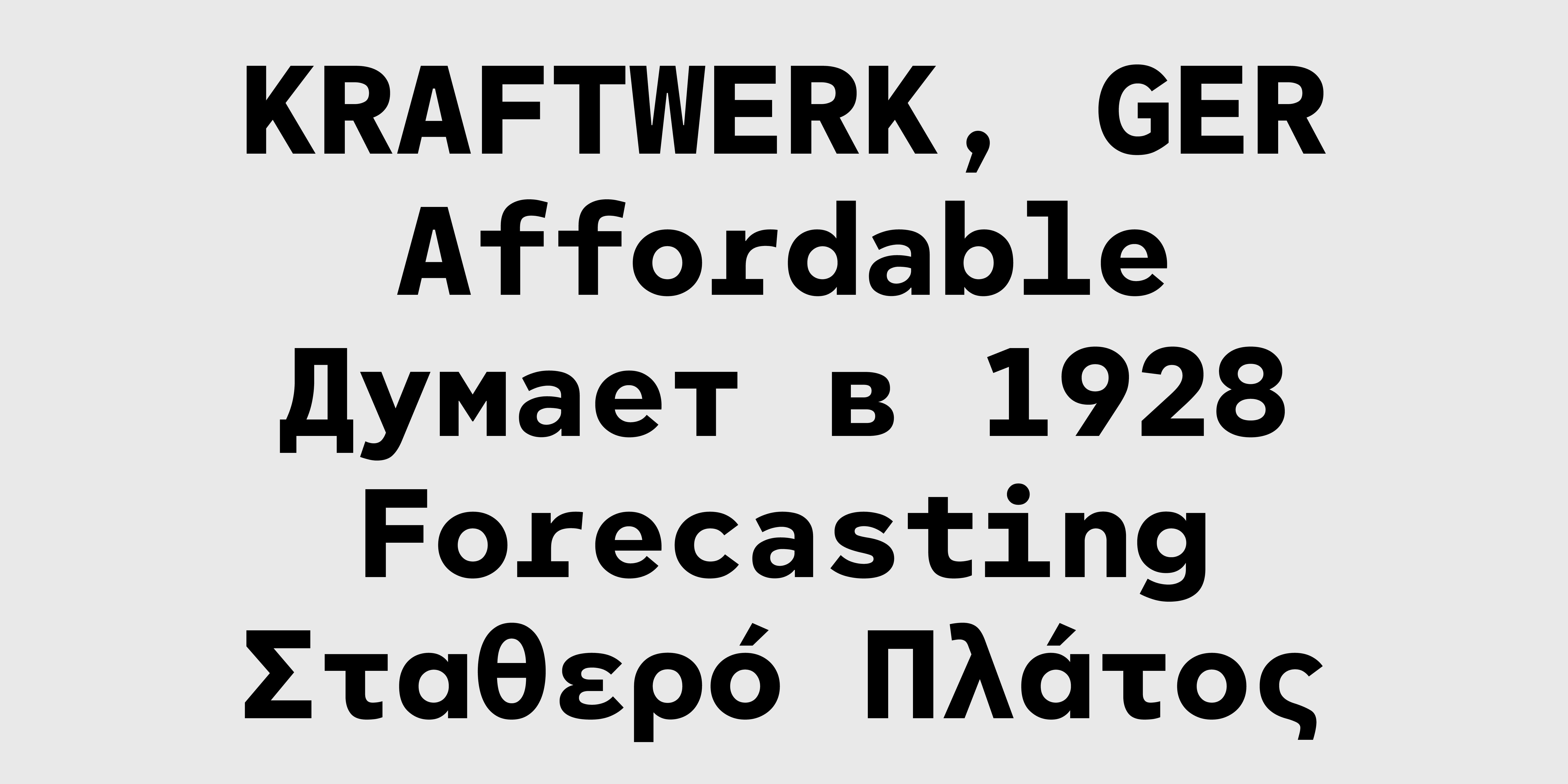 Thin Thin Oblique Light Light Oblique Regular Oblique Medium Medium Oblique Bold Bold Oblique Black Black ObliqueΗ πολύ δημοφιλής γραμματοσειρά CF Asty διαθέσιμη σε έκδοση σταθερού πλάτους (monospaced). Το σχέδιο έχει προσαρμοστεί με σκοπό να προσδώσει μια digital αισθητική, απαραίτητη για χρήσεις όπου απαιτείται μοντέρνα, ψηφιακή ή και φουτουριστική αίσθηση. Παράλληλα, με την κατάλληλη αυξομείωση του πλάτους των χαρακτήρων μέσα στο προκαθορισμένο χώρο που εντάσσεται ο καθένας, μειώνονται τα κενά και οι αντιφόρμες που προκύπτουν από την έλλειψη kerning με σκοπό να βελτιωθεί η ευαναγνωσιμότητα σε μεγαλύτερα κείμενα. Η CF Asty Mono υποστηρίζει Greek, Western, Extended Latin καθώς Cyrillic character sets ενώ είναι διαθέσιμη και σε Variable αρχείο χωρίς επιπλέον χρέωση.