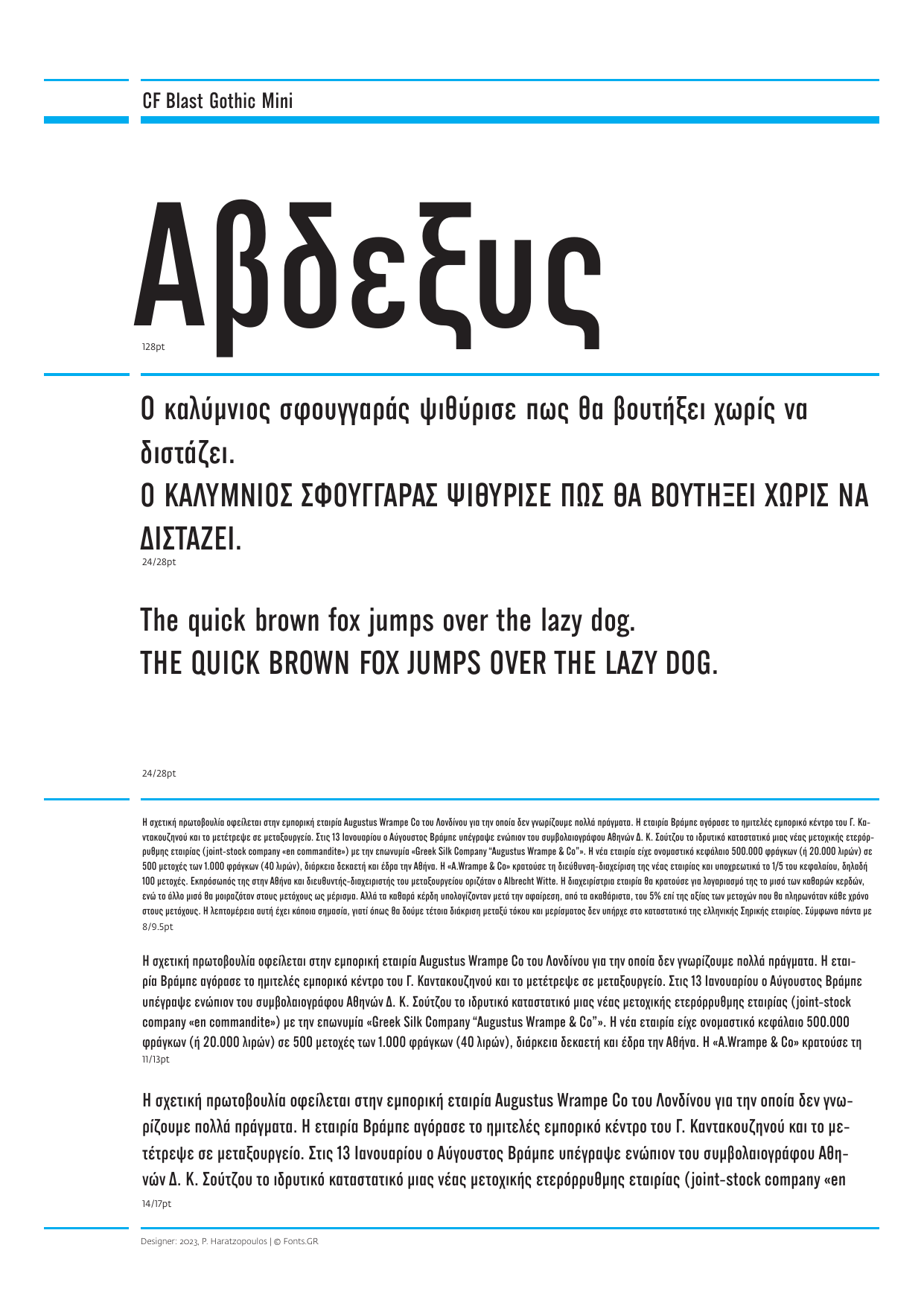 Η Blast Gothic έχει αναφορά στα σχέδια των αρχών του 20ου αιώνα και συγκεκριμένα στην Alternate Gothic του Morris Fuller Benton. Το χαρακτηριστικό στοιχείο της είναι τα τρία διαφορετικά ύψη των χαρακτήρων που όμως το καθένα από αυτά στοιχίζεται με τα άλλα στο ίδιο πλάτος. Η πρωτότυπη γραμματοσειρά, εκτός από το ιδιαίτερο στενό σχέδιο χαρακτηριζόταν και από μόνο παχιά γράμματα για βαρείς τίτλους. Στη νέα έκδοση, η Blast Gothic, εξακολουθεί να αποτελείται από τρία ύψη στενών γραμματοσειρών, που όμως έχουν πλαισιωθεί από 8 διαφορετικά πάχη για κάθε ύψος και αντίστοιχα σχεδιασμένα πλάγια. Συνολικά δηλαδή 48 γραμματοσειρές, 16 για την μέσου ύψους Medi, 16 για τη χαμηλή Mini και επίσης 16 για την ψηλή Maxi. Σε συνδυασμό με τις ενδιάμεσες διαστάσεις που παρέχει η Variable εκδοχή (δωρεάν στο συνολικό πακέτο), κάνουν την Blast Gothic μια ιδανική λύση για τίτλους, σε μοντέρνα sites, για λογοτύπηση ή αφίσες. Η πολυμορφικότητα που παρέχουν τα διαφορετικά ύψη και πάχη μπορούν να προσδώσουν μια ιδιαίτερη εικόνα σε κάθε εργασία που θα χρησιμοποιηθεί. Η Blast Gothic υποστηρίζει Λατινικό (Extended) και Ελληνικό μονοτονικό, 4 διαφορετικούς τρόπους αρίθμησης, κλάσματα, δείκτες κλπ.