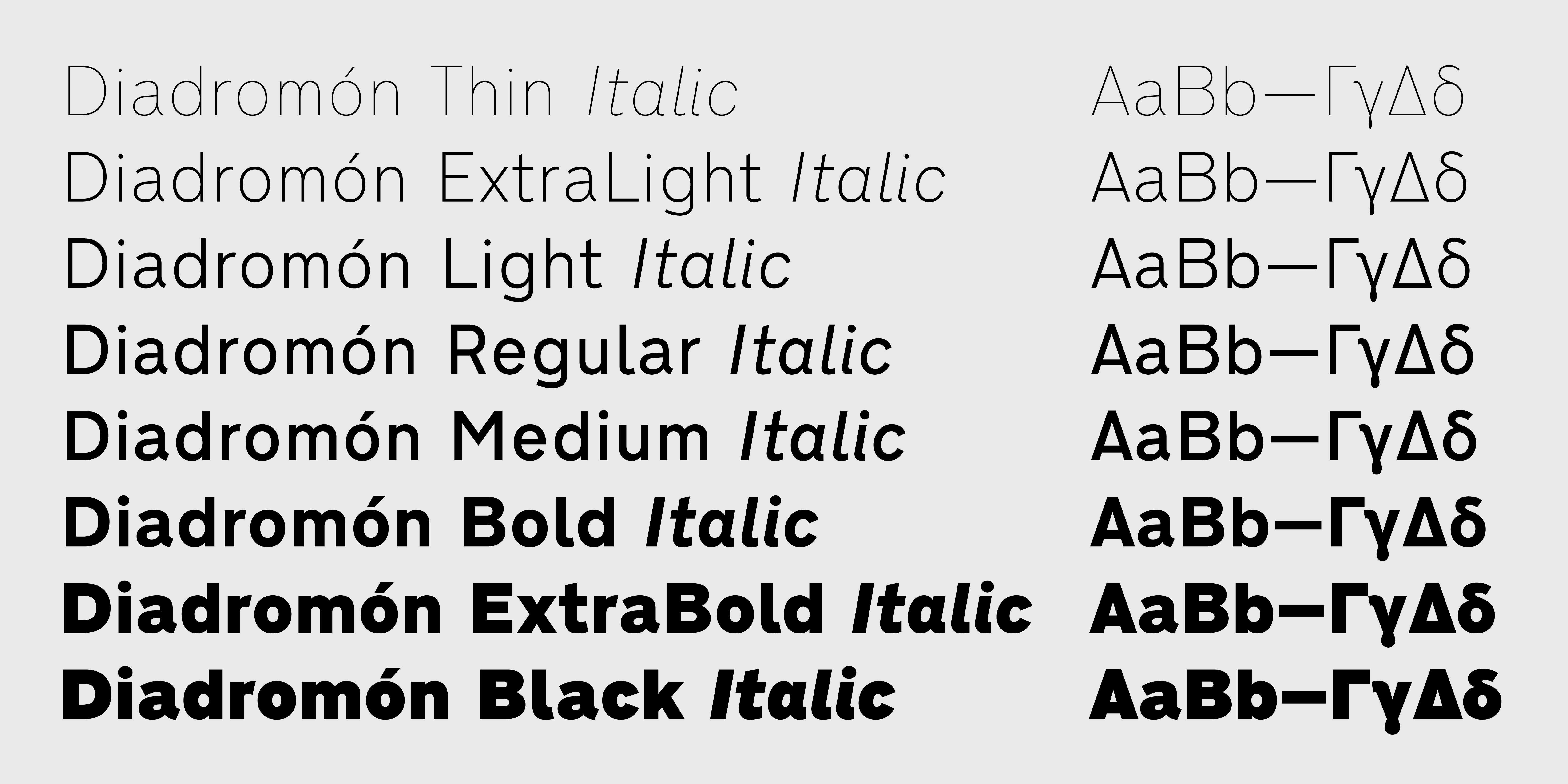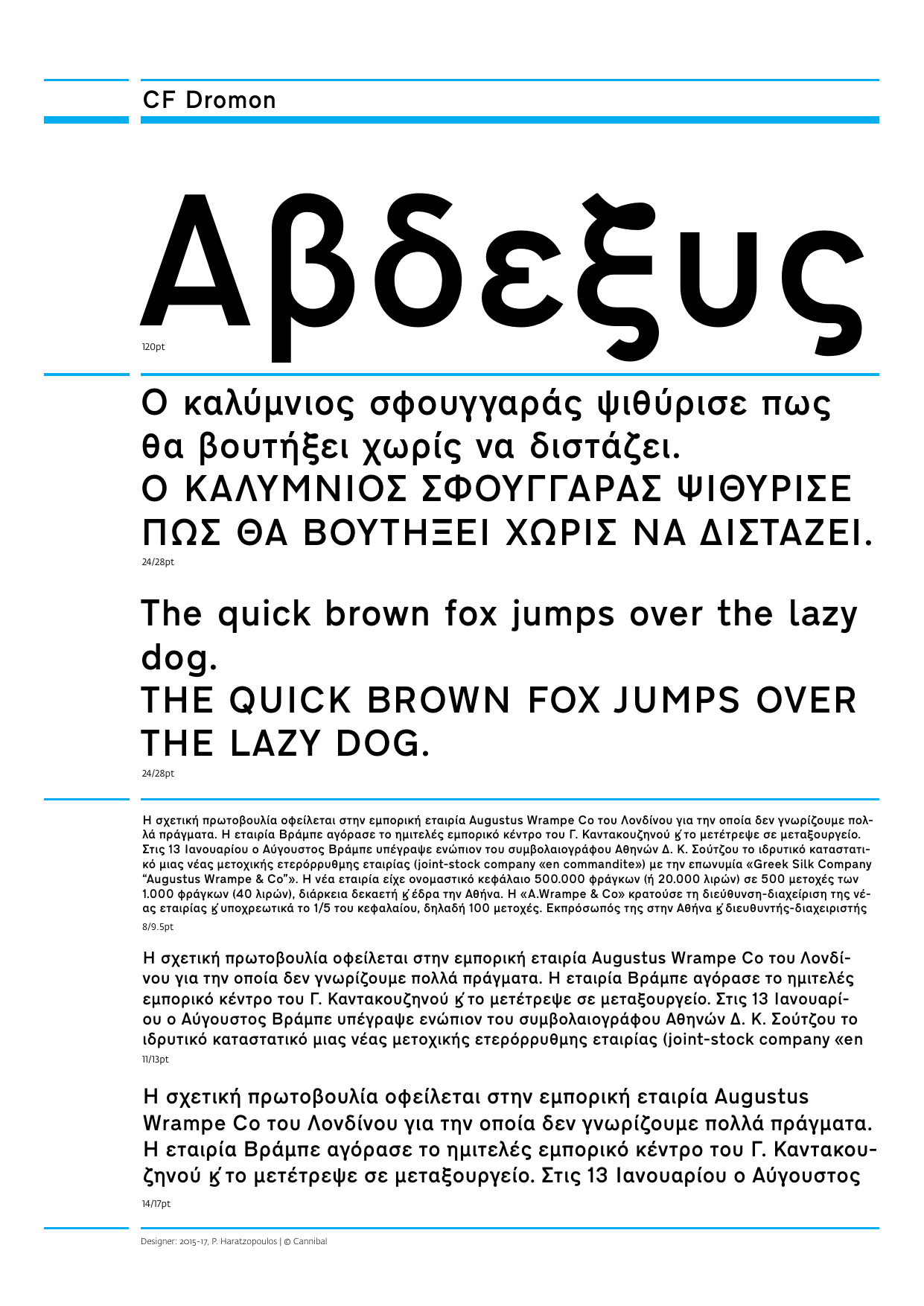 Η CF DiaDromon σχεδιάστηκε από τον Παναγιώτη Χαρατζόπουλο στο πλαίσιο εργασίας για τον εξορθολογισμό της οδικής σήμανσης. Αποτελεί αναβίωση των γραμμάτων που είναι σε όλους μας γνωστά από τις μπλε πινακίδες των επαρχιακών δρόμων και τοπονύμιων της χώρας. Αρχικά, η γραμματοσειρά της Σήμανσης σχεδιάστηκε και υιοθετήθηκε από το Υπουργείο Δημοσίων Έργων το 1974 έχοντας προκύψει από την προσαρμογή του βρετανικού προτύπου που σχεδιάστηκε από τον Jock Kinneir και τη συνεργάτιδα του Margaret Calvert στη δεκαετία του 60. Η ψηφιακή έκδοση CF Dromon, απαλλαγμένη από λάθη και σχεδιαστικές ασυνέπειες της αρχικής γραμματοσειράς, υποστηρίζει Ελληνικό Μονοτονικό και πλήρες Δυτικό Λατινικό σύνολο χαρακτήρων (συμπ. Ρουμανικών και Τουρκικών), αριθμούς σταθερού πλάτους, κλάσματα κ.λπ. Το 2017 η CF Dromon εμπλουτίστηκε με νέα βάρη.