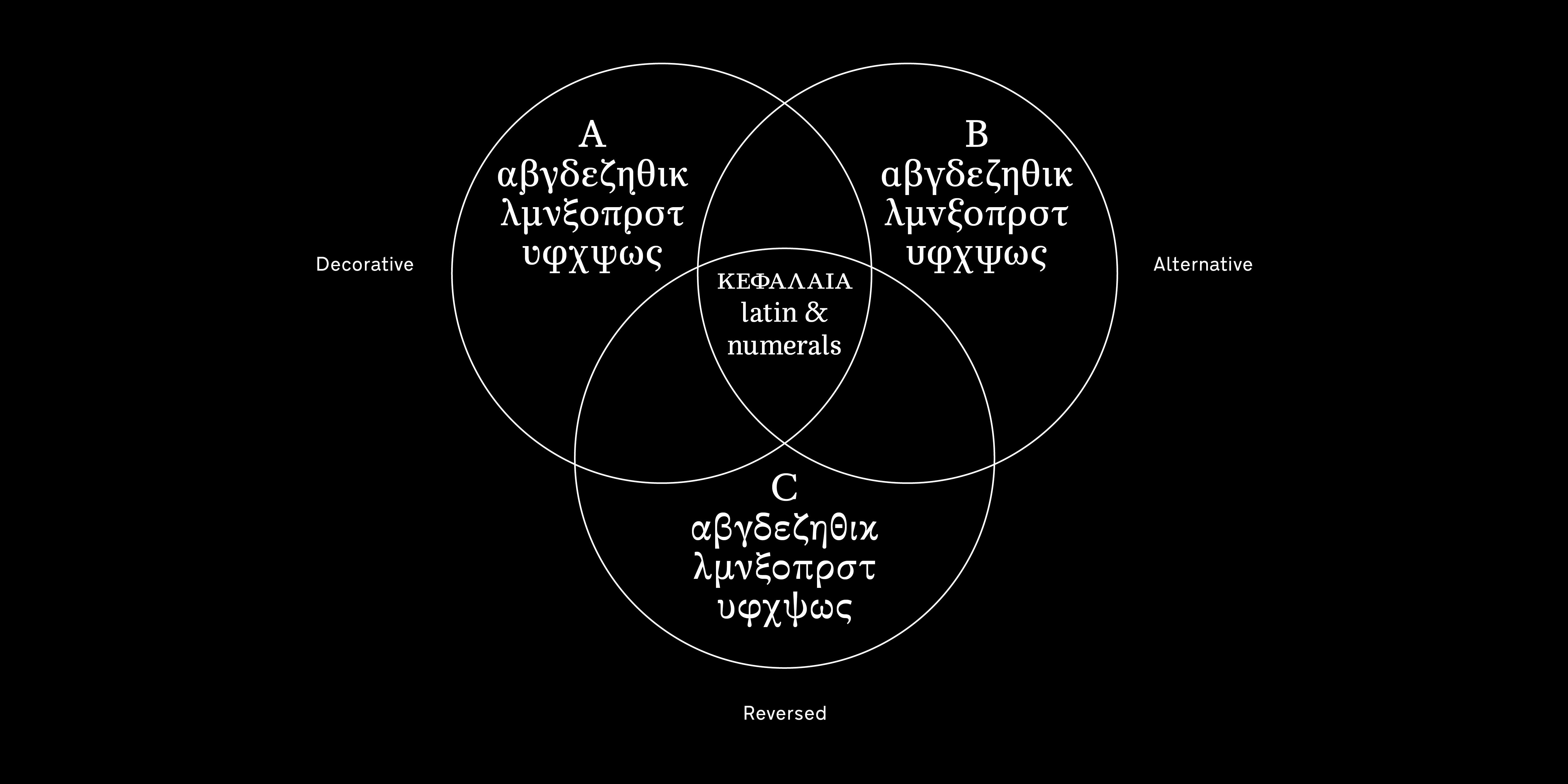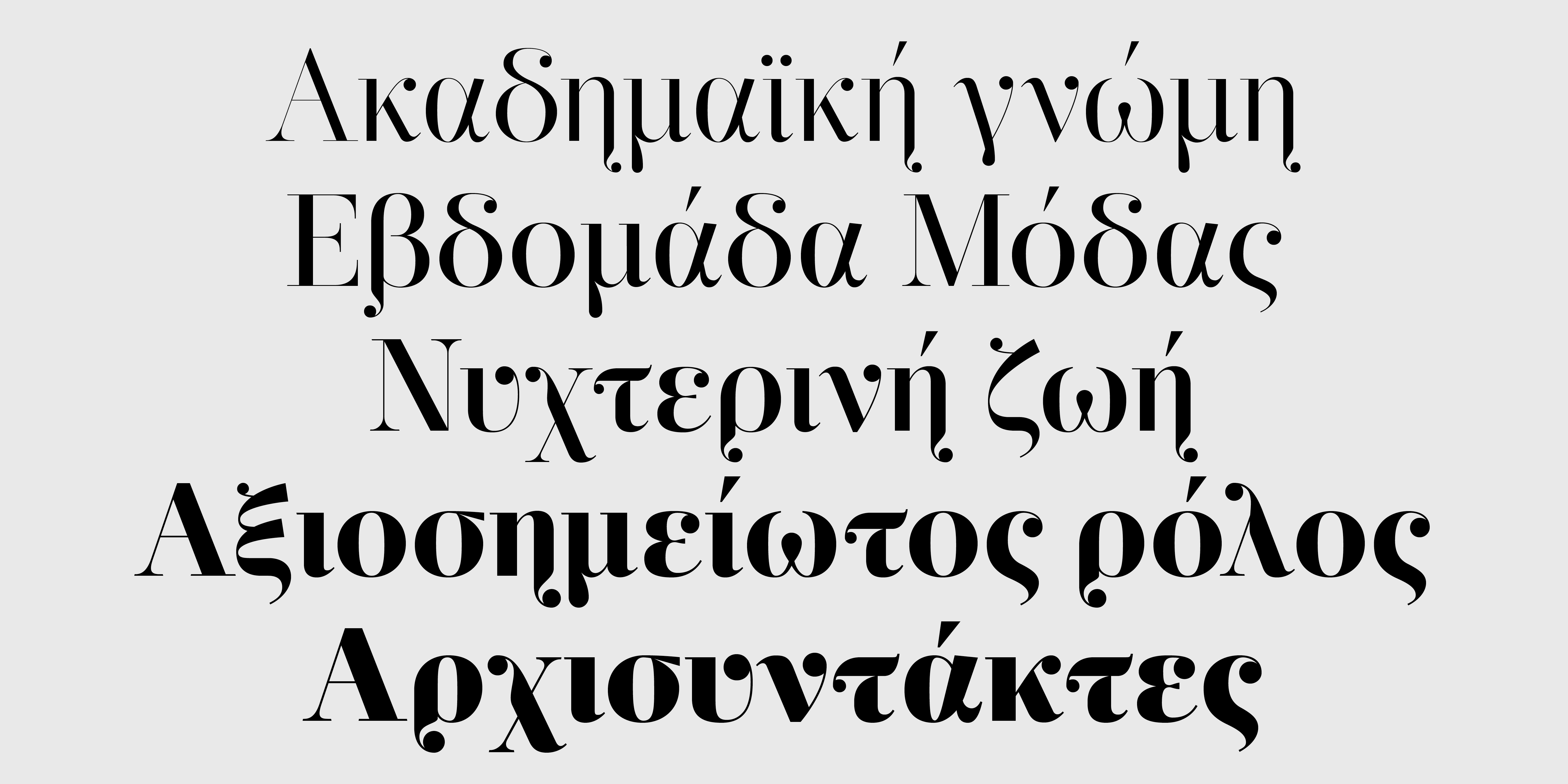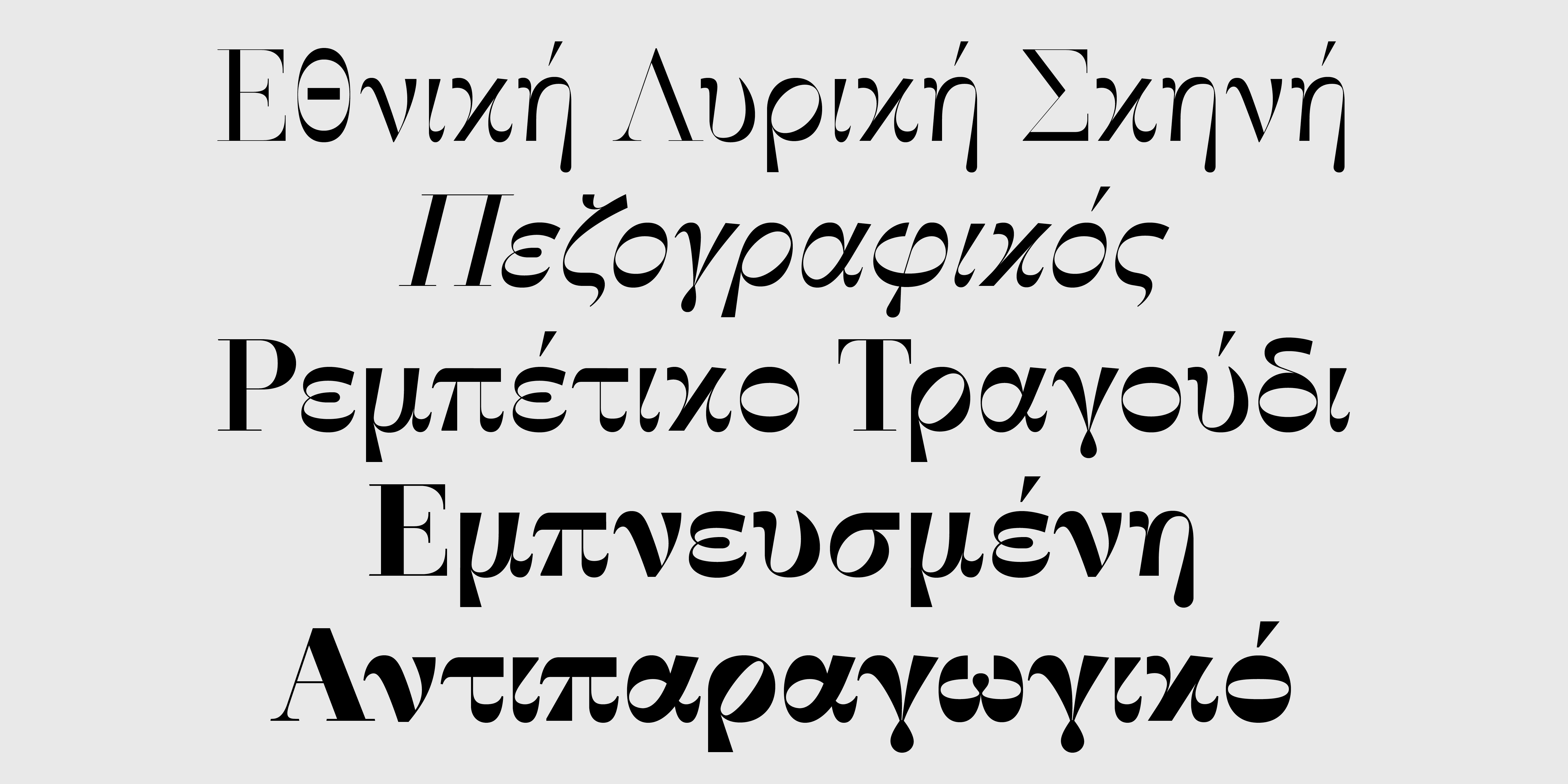 Είναι διαθέσιμη είτε σε μεμονωμένα βάρη/στυλ, όρθια και πλάγια με Small Caps και Πολυτονικούς χαρακτήρες, σε 3 σετ των 20 γραμματοσειρών (10 Display και 10 Text), είτε σε ένα ενιαίο Variable αρχείο με δυνατότητα χρήσης όλων των παραλλαγών καθώς και των ενδιάμεσων σταδίων. Οι Λατινικοί χαρακτήρες και αριθμοί που περιλαμβάνονται έχουν μόνο μικρές στυλιστικές διαφορές μεταξύ των τριών Ελληνικών εκδοχών.