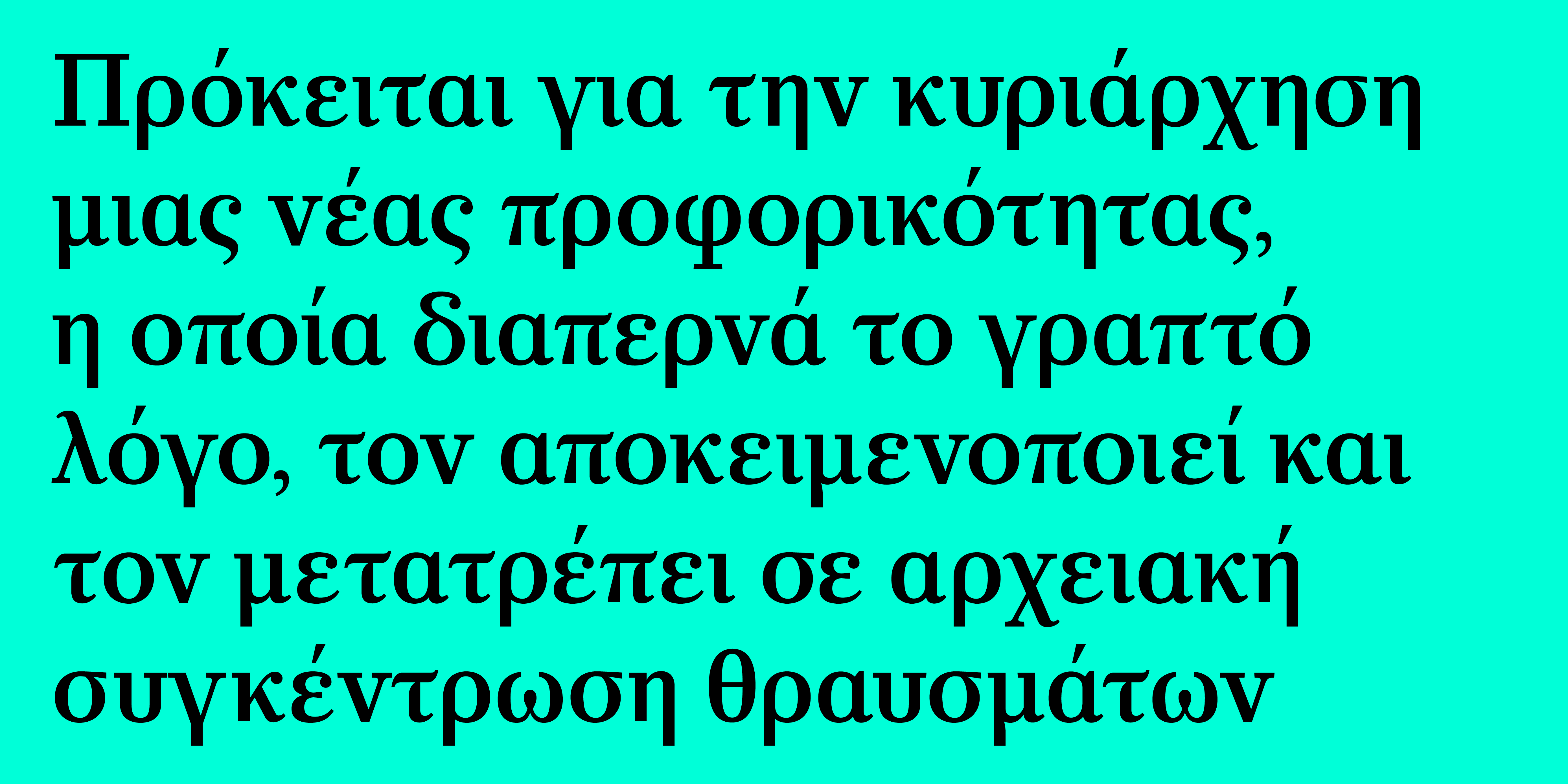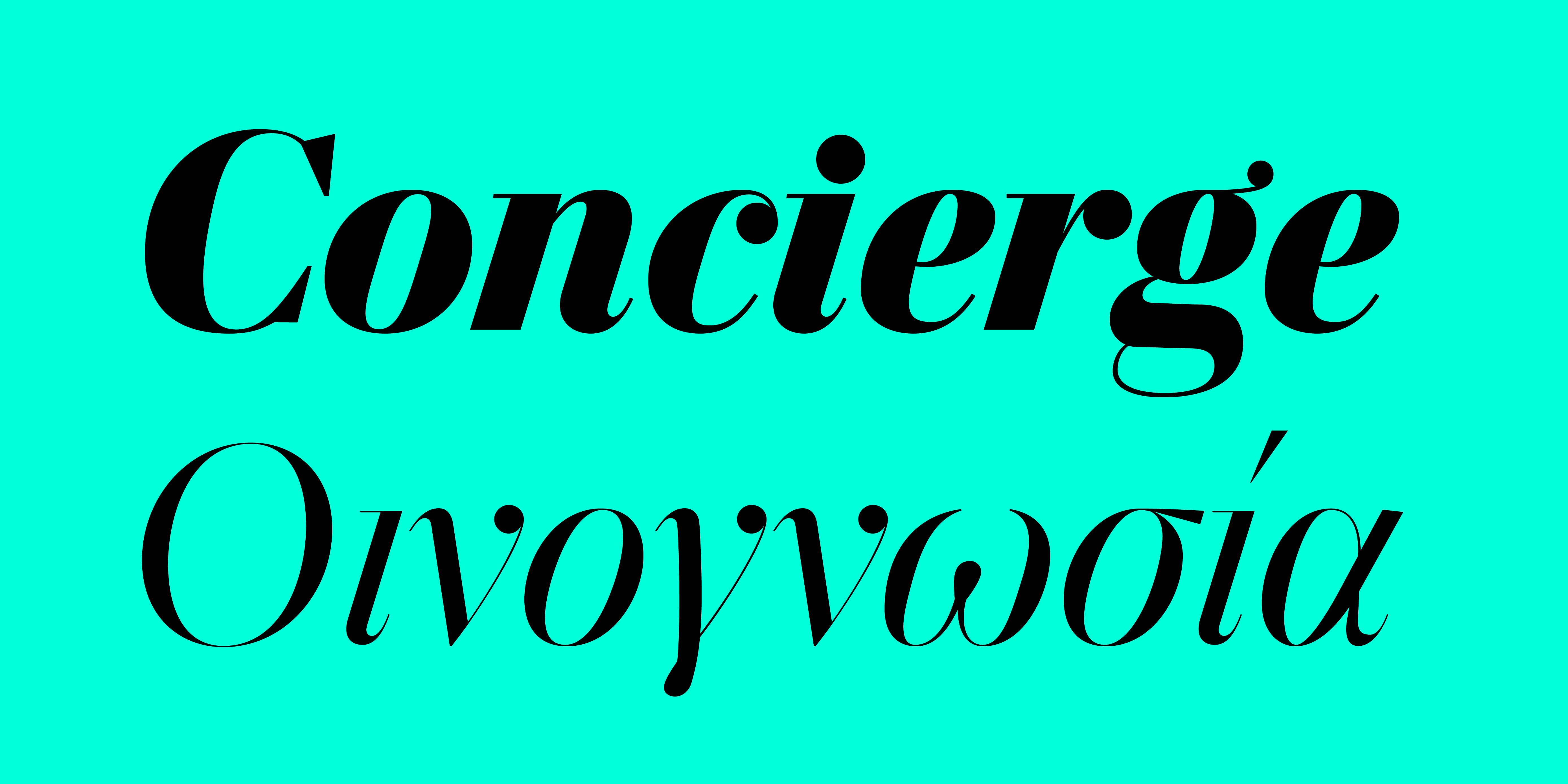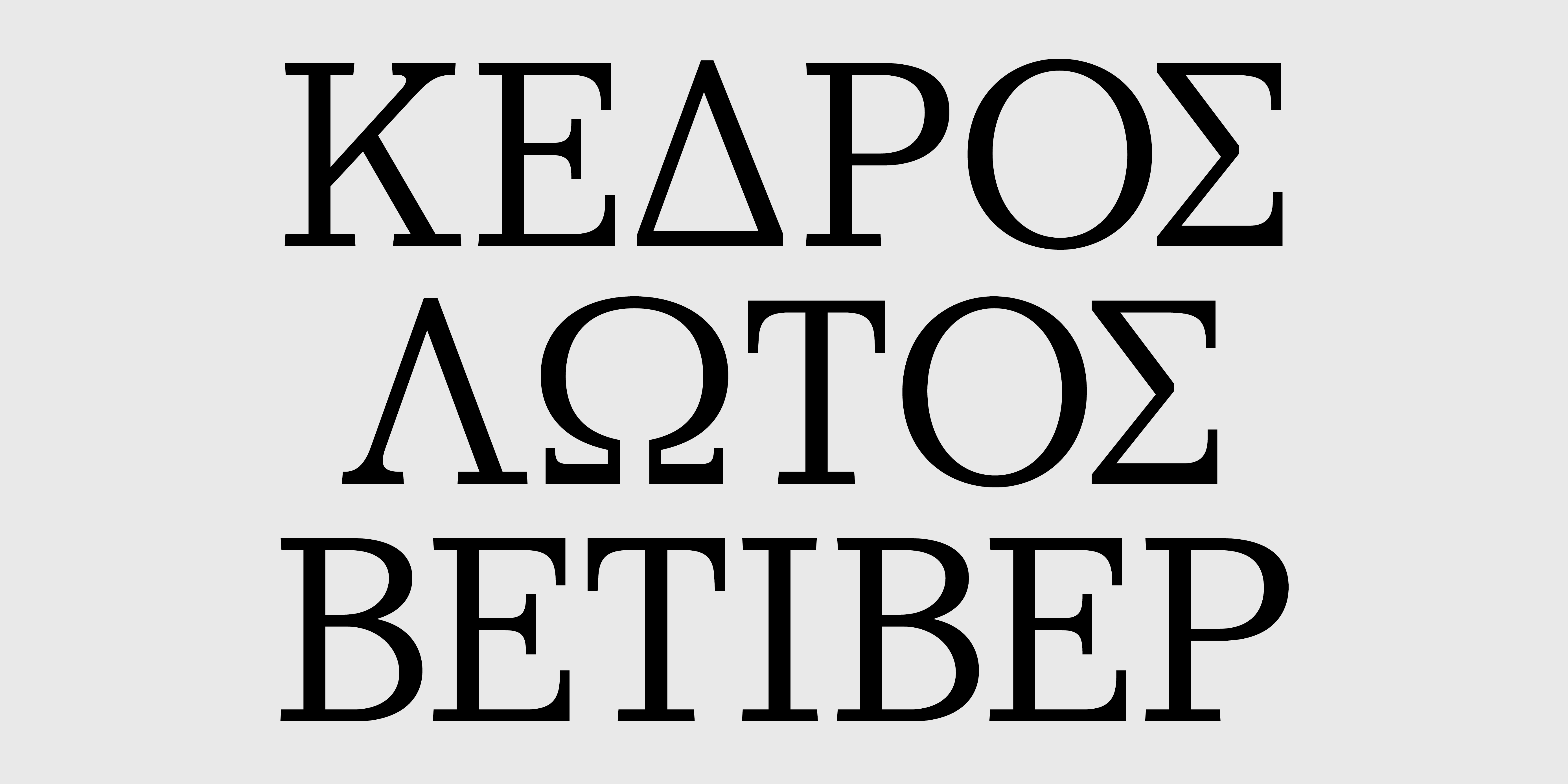 Είναι διαθέσιμη είτε σε μεμονωμένα βάρη/στυλ, όρθια και πλάγια με Small Caps και Πολυτονικούς χαρακτήρες, σε 3 σετ των 20 γραμματοσειρών (10 Display και 10 Text), είτε σε ένα ενιαίο Variable αρχείο με δυνατότητα χρήσης όλων των παραλλαγών καθώς και των ενδιάμεσων σταδίων. Οι Λατινικοί χαρακτήρες και αριθμοί που περιλαμβάνονται έχουν μόνο μικρές στυλιστικές διαφορές μεταξύ των τριών Ελληνικών εκδοχών.