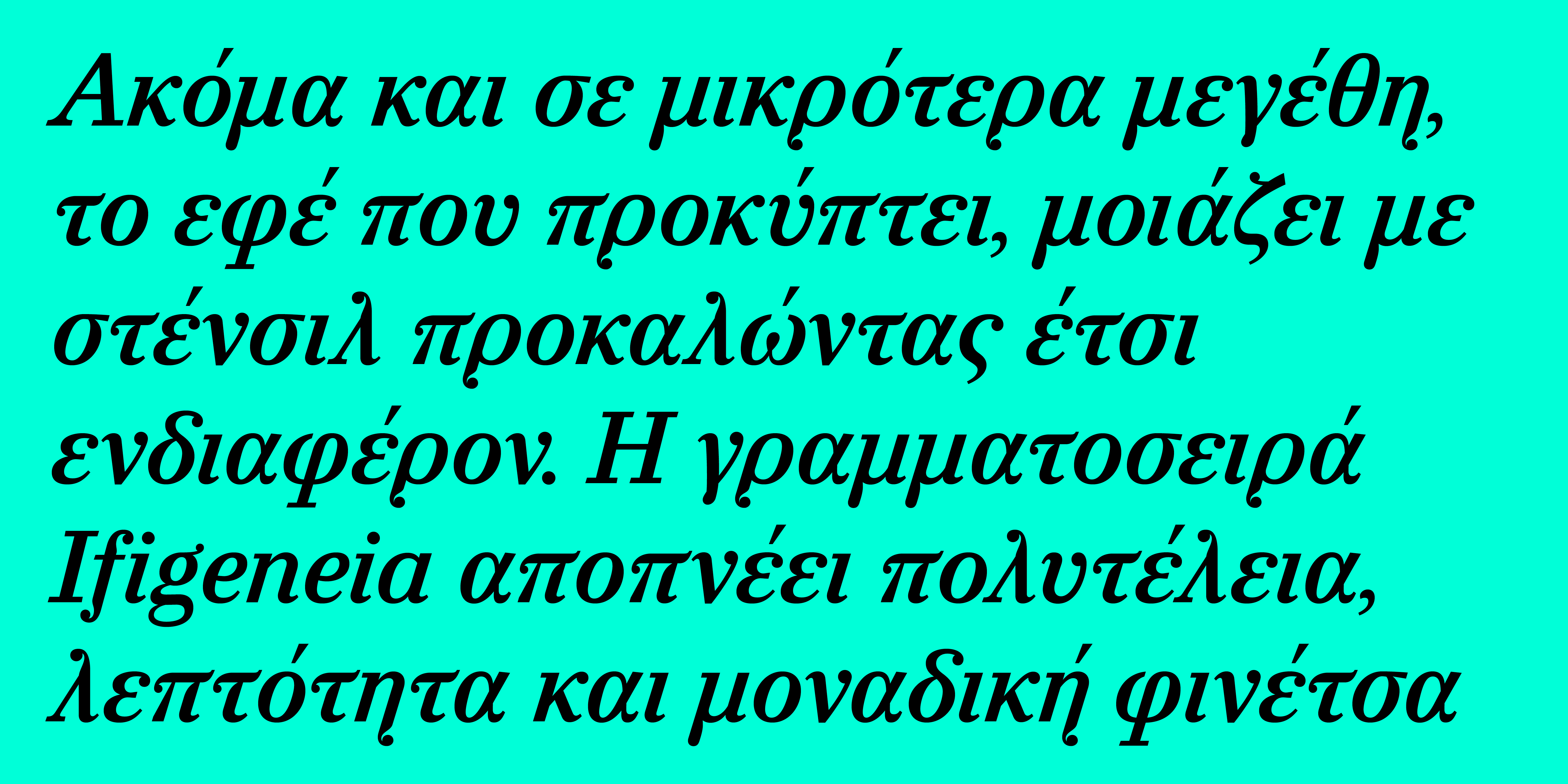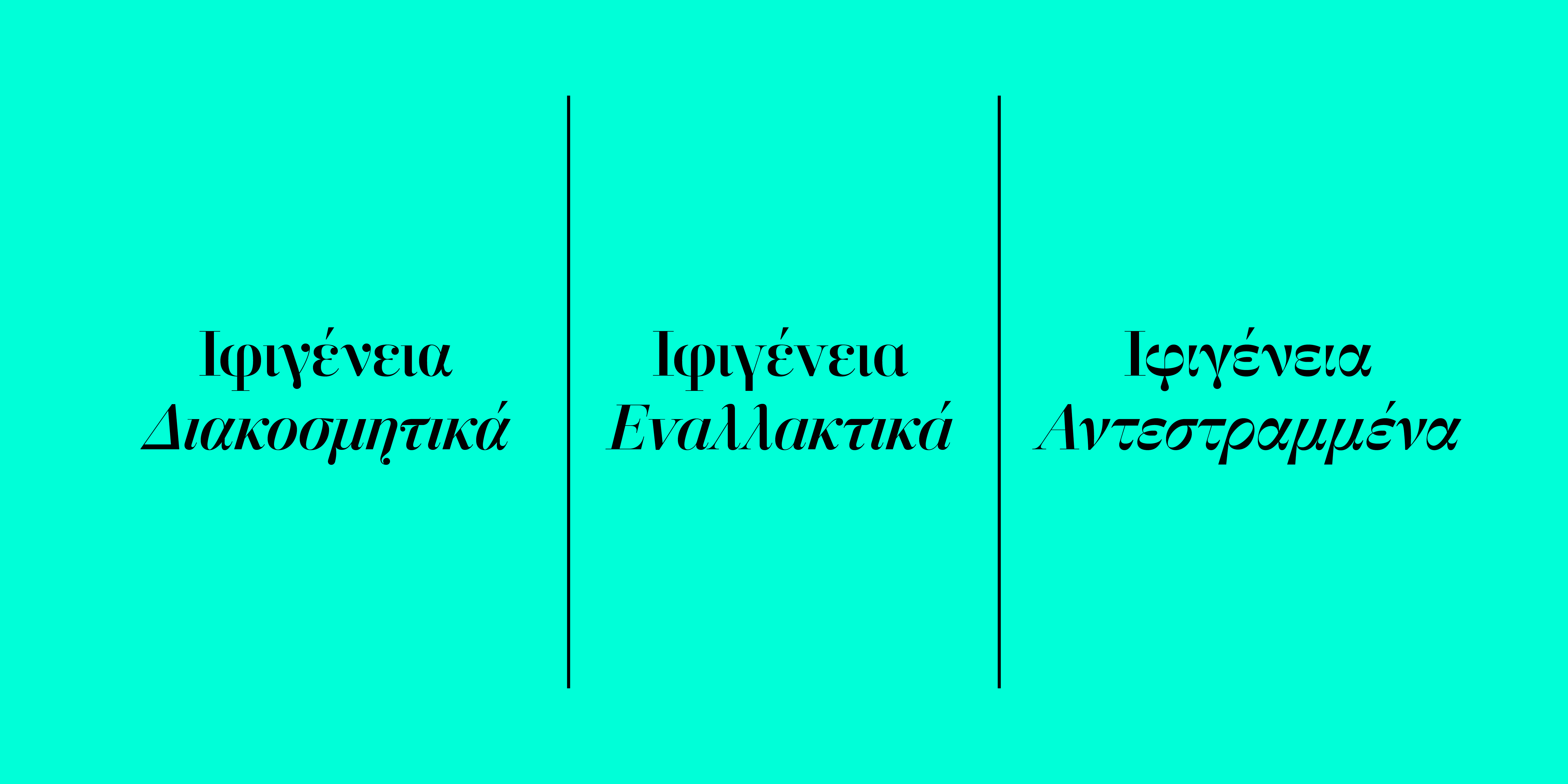 H CF Ifigeneia είναι μια πολυμορφική ανισόπαχη γραμματοσειρά που περιλαμβάνει τρεις διαφορετικές σχεδιαστικές προσεγγίσεις στα Ελληνικά. Την αρχική, που είναι μια Διακοσμητική προσέγγιση, την Εναλλακτική (alt) που ακολουθεί μια εκδοχή πιο κοντά στα λατινικά στοιχεία και την Αντεστραμμένη που παραπέμπει στα Απλά της Μονοτυπίας. Παράλληλα, διατίθεται σε δύο τύπους αντιθέσεων· υψηλού κοντράστ για χρήση σε τίτλους και μεγάλες στιγμές γραμμάτων και χαμηλού κοντράστ για χρήση σε κείμενα και μικρά μεγέθη.