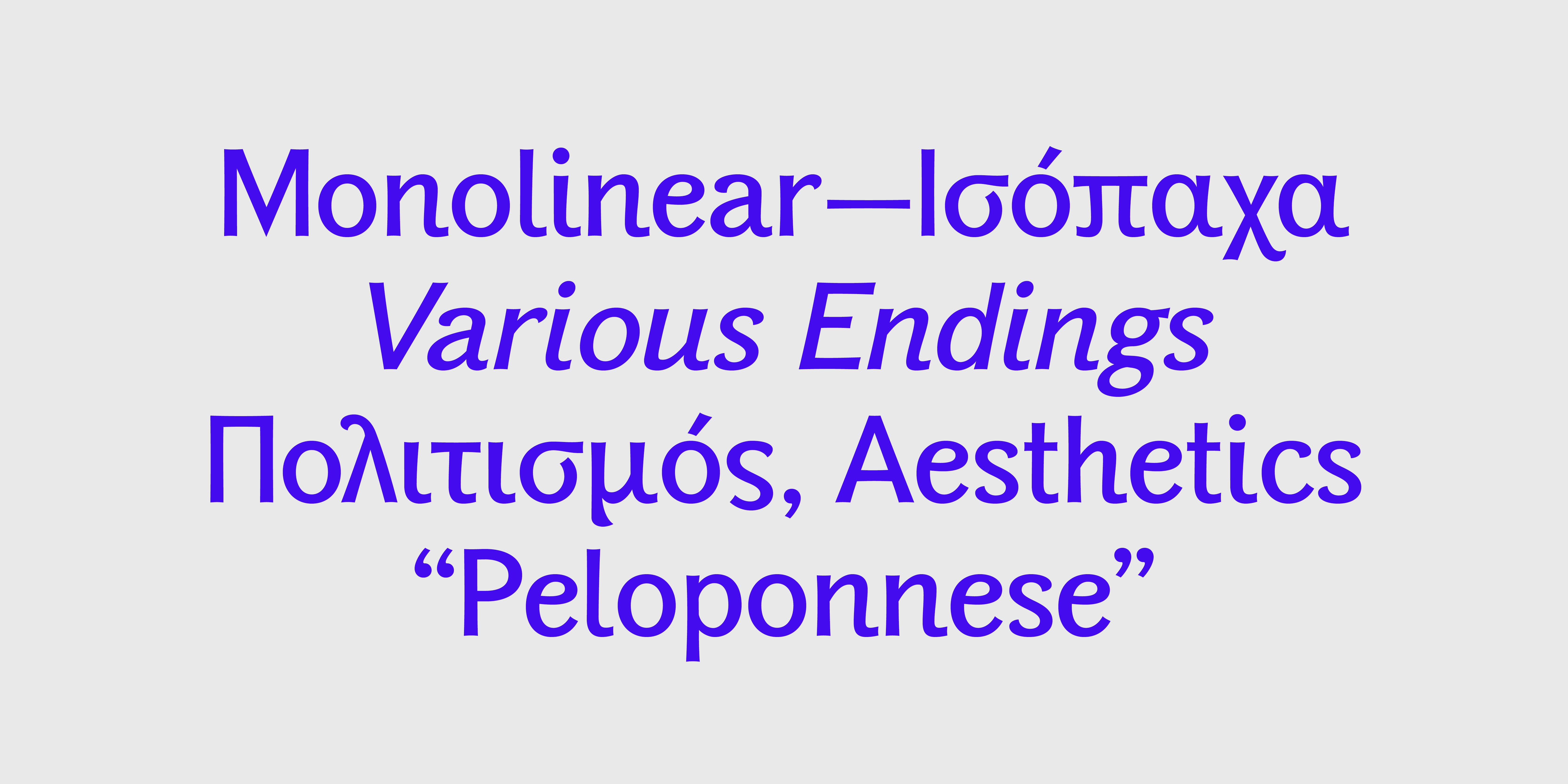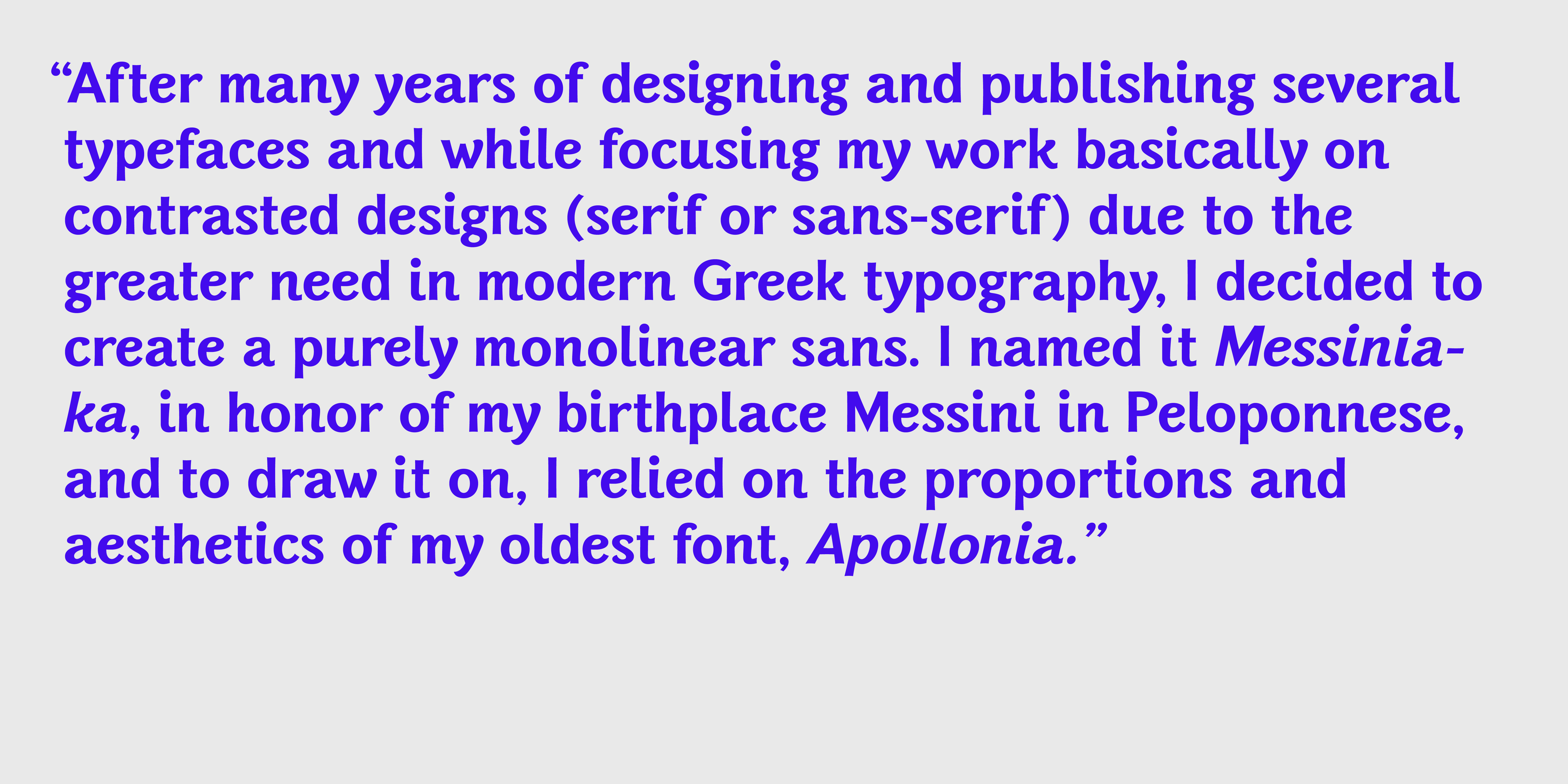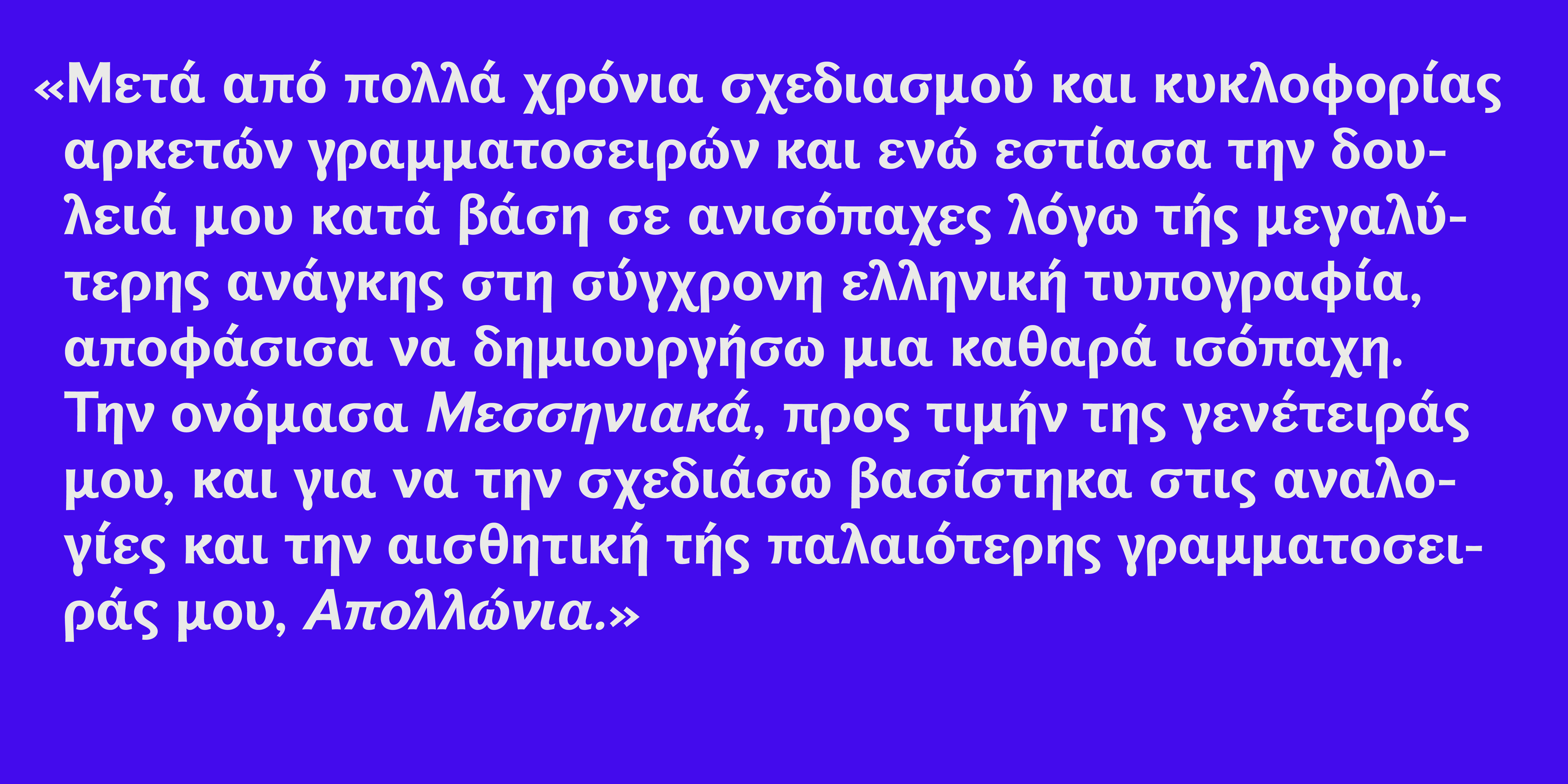 Τάκης Κατσουλίδης: Μετά από πολλά χρόνια σχεδιασμού και κυκλοφορίας αρκετών γραμματοσειρών και ενώ εστίασα την δουλειά μου κατά βάση σε ανισόπαχες λόγω τής μεγαλύτερης ανάγκης στη σύγχρονη ελληνική τυπογραφία, αποφάσισα να δημιουργήσω μια καθαρά ισόπαχη. Την ονόμασα Μεσσηνιακά, προς τιμήν της γενέτειράς μου, και για να την σχεδιάσω βασίστηκα στις αναλογίες και την αισθητική τής παλαιότερης γραμματοσειράς μου, Απολλώνια. Στον ψηφιακό σχεδιασμό συνέβαλε ο Δημήτρης Μπόβολος, με τελική επιμέλεια των Βασίλη Γεωργίου και Παναγιώτη Χαρατζόπουλου.