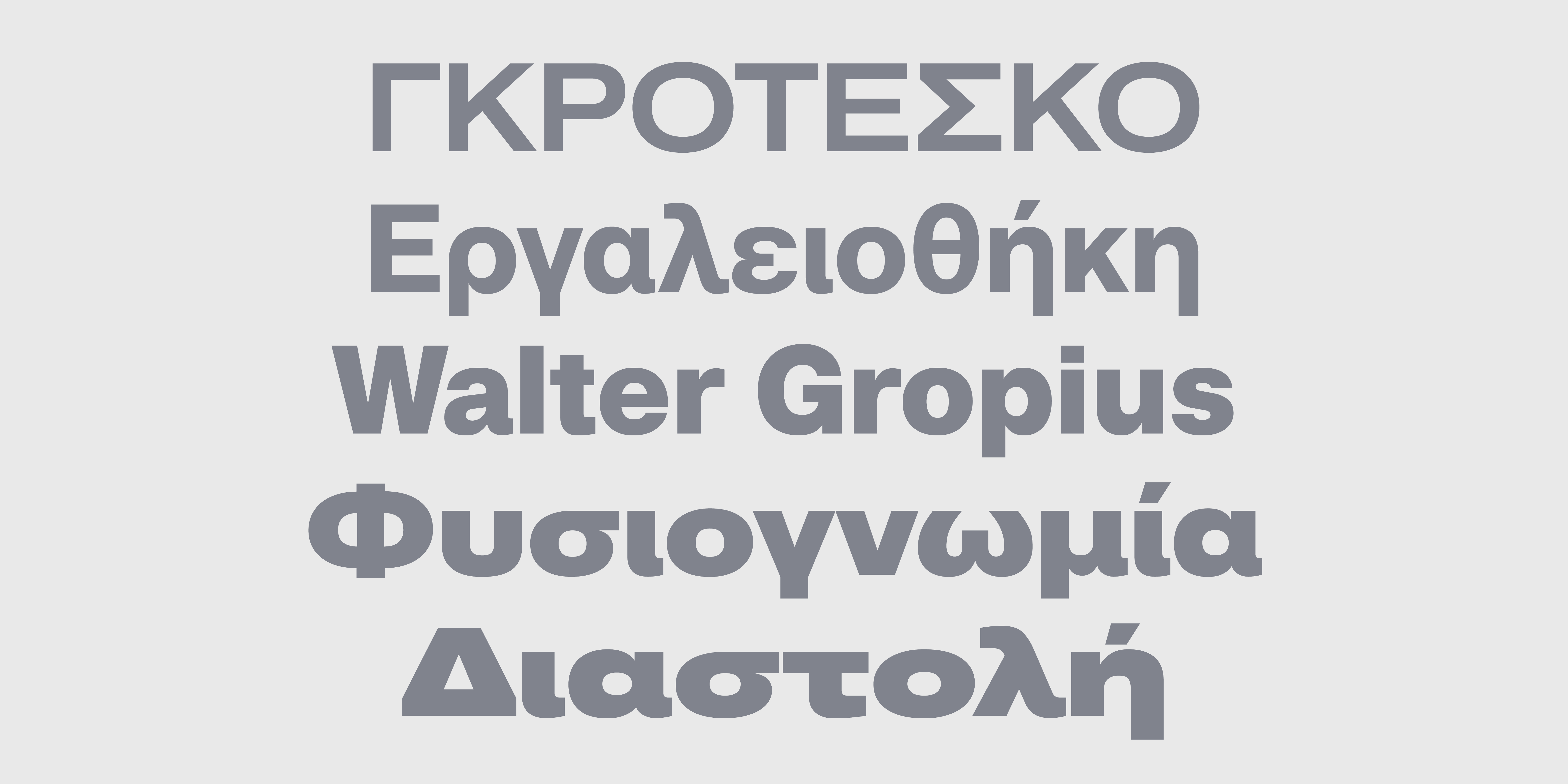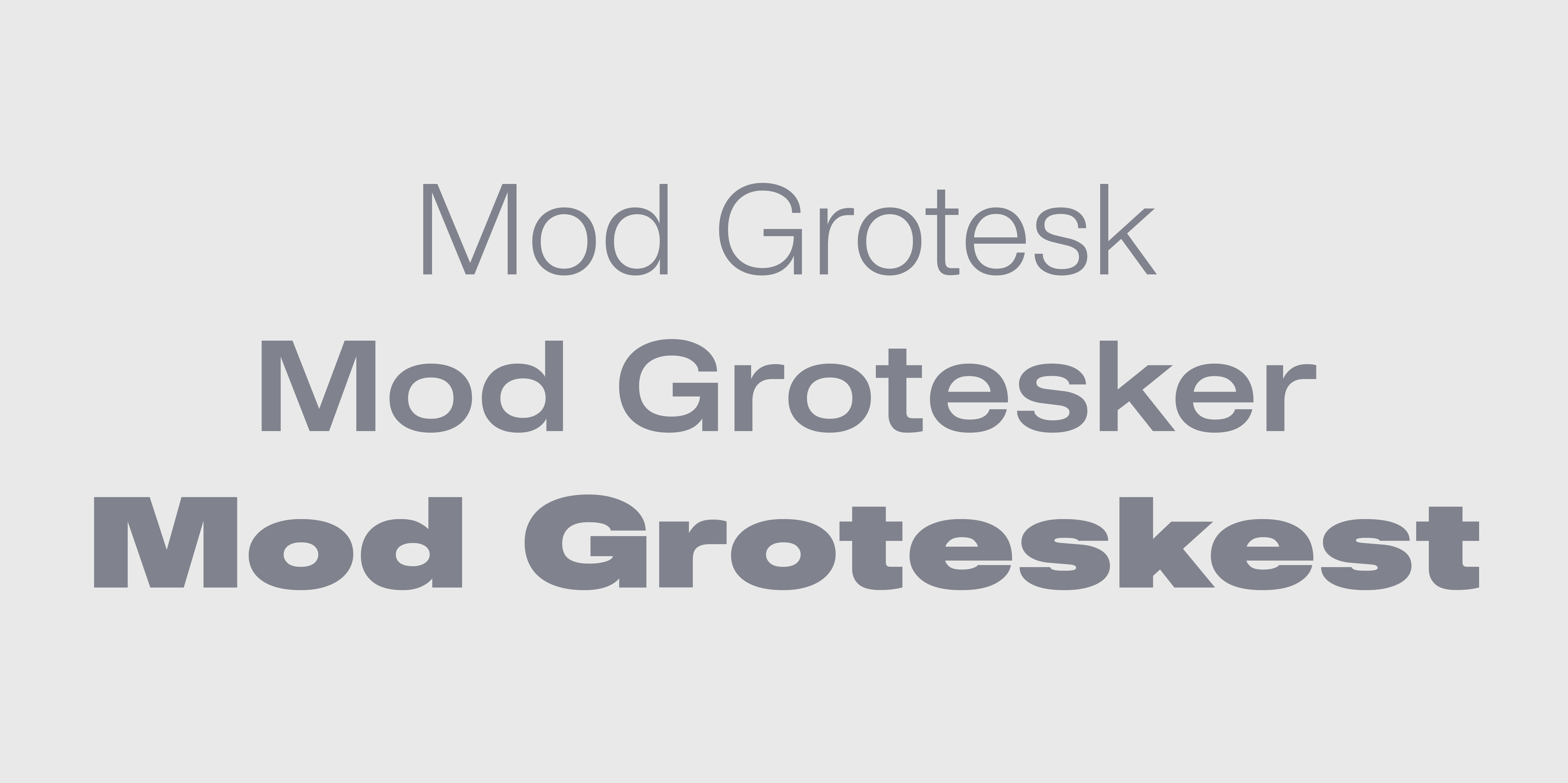 Thin Thin Oblique ExtraLight ExtraLight Oblique Light Light Oblique Regular Regular Oblique Medium Medium Oblique SemiBold SemiBold Oblique Bold Bold Oblique ExtraBold ExtraBold Oblique Ultra Ultra Oblique Thin Extra Expanded Thin Extra Expanded Oblique ExtraLight Extra Expanded ExtraLight Extra Expanded Oblique Light Extra Expanded Light Extra Expanded Oblique Regular Extra Expanded Regular Extra Expanded Oblique Medium Extra Expanded Medium Extra Expanded Oblique SemiBold Extra Expanded SemiBold Extra Expanded Oblique Bold Extra Expanded Bold Extra Expanded Oblique ExtraBold Extra Expanded ExtraBold Extra Expanded Oblique Ultra Extra Expanded Ultra Extra Expanded Oblique Thin Expanded Thin Expanded Oblique ExtraLight Expanded ExtraLight Expanded Oblique Light Expanded Light Expanded Oblique Regular Expanded Regular Expanded Oblique Medium Expanded Medium Expanded Oblique SemiBold Expanded SemiBold Expanded Oblique Bold Expanded Bold Expanded Oblique ExtraBold Expanded ExtraBold Expanded Oblique Ultra Expanded Ultra Expanded ObliqueΙσόπαχη γραμματοσειρά με αναφορές στο ουδέτερο ύφος των γραμματοσειρών από τα δεύτερο μισό του 20ου αιώνα, όπως Helvetica, Univers, Folio κλπ. Το ελαφρώς μεγαλύτερο κοντράστ καθώς και κάποιες σχεδιαστικές λεπτομέρειες τής προσδίδουν μια μικρή ιδιαιτερότητα σε σχέση με άλλες παρόμοιες γραμματοσειρές. Τα ελληνικά ακολουθούν το σχεδιαστικό ύφος των ελληνικών Helvetica του M. Carter από τη δεκαετία του 70. Η Modern Grotesk CF σχεδιάστηκε αρχικά για το Μουσείο Νεοελληνικής Τέχνης του Δήμου Ρόδου, αν και στη γραμματοσειρά του Μουσείου διατηρήθηκε μια μεγαλύτερη εκφραστικότητα προκειμένου να εξυπηρετηθούν οι ανάγκες που απαιτούσε η εταιρική εικόνα και ταυτότητα. Η Modern Grotesk είναι διαθέσιμη και σε αρχεία Variable font χωρίς επιπλέον χρέωση.