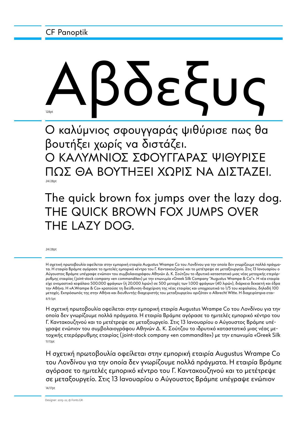Η CF Panoptik είναι μια εξέλιξη της δημοφιλούς Futura, κάπως λιγότερο γεωμετρική, εξίσου όμως καθαρή και αρκετά αναλογικότερη. Αρχικά σχεδιάστηκε ως εταιρική γραμματοσειρά για την Παγκρήτια Τράπεζα και αργότερα εμπλουτίστηκε με περισσότερα βάρη για να κυκλοφορήσει στην αγορά. Η τελευταία έκδοση (9/2022) υποστηρίζει και Ελληνικό Πολυτονικό, πλέον του Western, Extended Latin και Μονοτονικού. Είναι διαθέσιμη και σε Variable αρχείο χωρίς επιπλέον χρέωση.