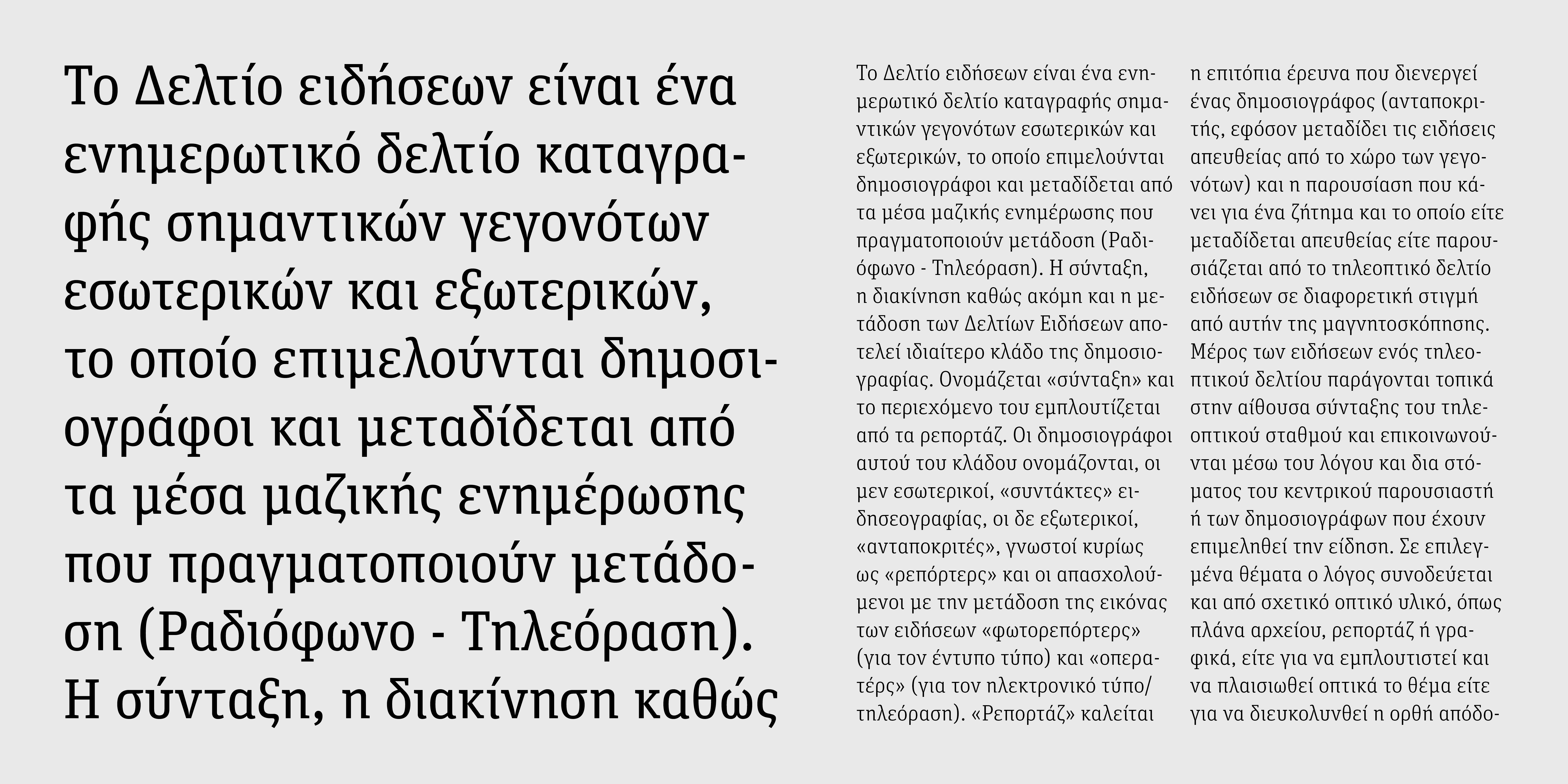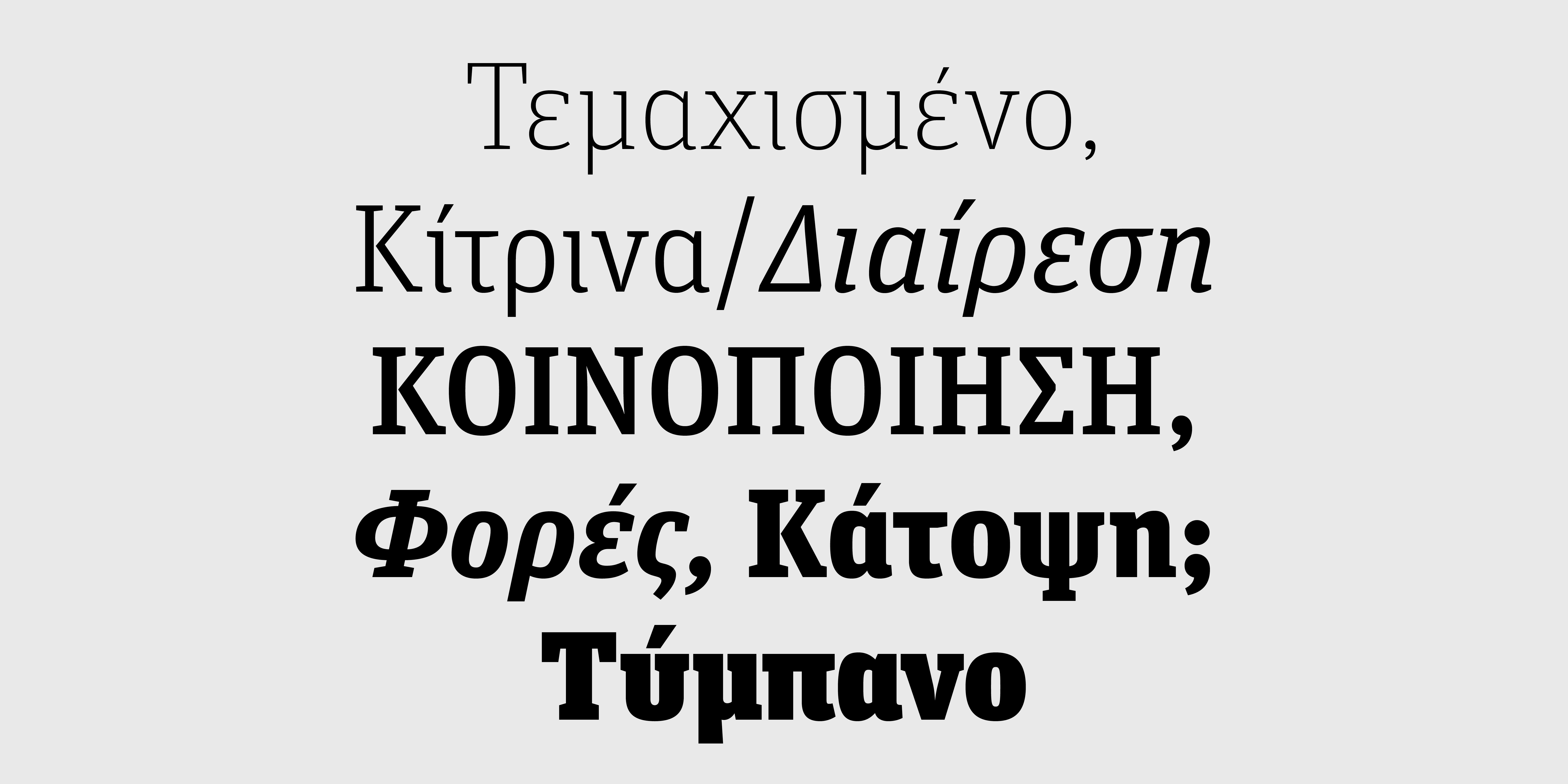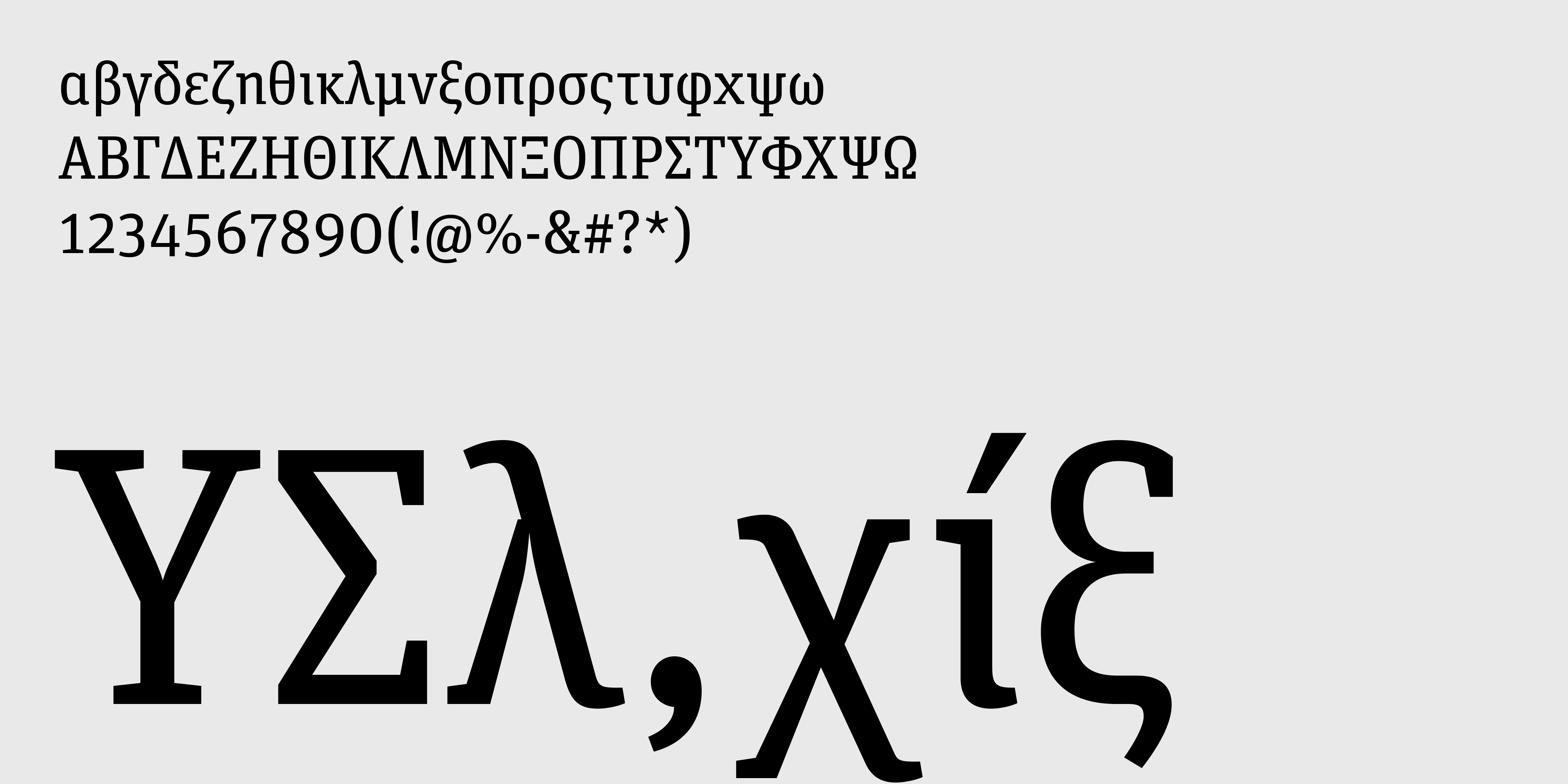 Thin Thin Italic Black Black Italic Ultra Italic UltraΕίναι μια σχετικά στενή ανισόπαχη γραμματοσειρά με χοντρές, τετράγωνες (Slab) πατούρες. Ιδανική για τίτλους αλλά επίσης πολύ καλή και για κείμενο, αφού είναι μεν γεωμετρική αλλά συνδυάζει ανθρωπιστικά στοιχεία σχεδιασμού. Περιλαμβάνει λατινικούς, ελληνικούς και κυριλλικούς χαρακτήρες υποστηρίζοντας πάνω από 70 γλώσσες ενώ διαθέτει πολλούς διαφορετικούς τρόπους αρίθμησης. Τα ελληνικά αρχικά σχεδιάστηκαν για την εφημερίδα «ΜΕΤΡΟ».